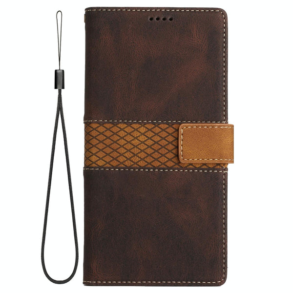 For iPhone 14 Pro Grid Stitching Leather Phone Case with Lanyard(Brown)