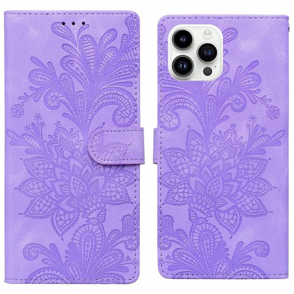 For iPhone 14 Pro Lace Floral Embossed Magnetic Buckle Leather Phone Case(Purple)