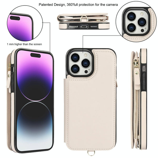 For iPhone 14 Pro Max Double Flap Zipper RFID Leather Phone Case with Short Lanyard(White)
