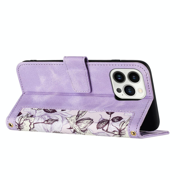 For iPhone 14 Pro Max Floral Pattern Leather Phone Case with Lanyard(Light Purple)