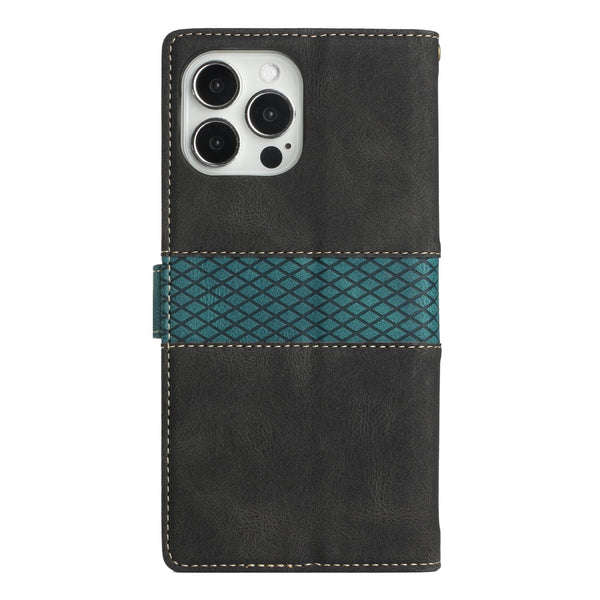 For iPhone 14 Pro Max Grid Stitching Leather Phone Case with Lanyard(Black)