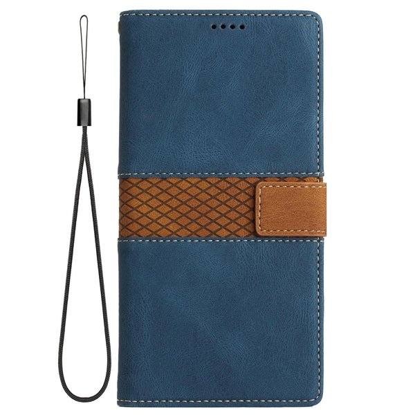 For iPhone 14 Pro Max Grid Stitching Leather Phone Case with Lanyard(Blue)