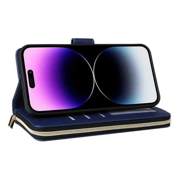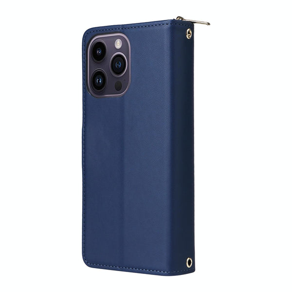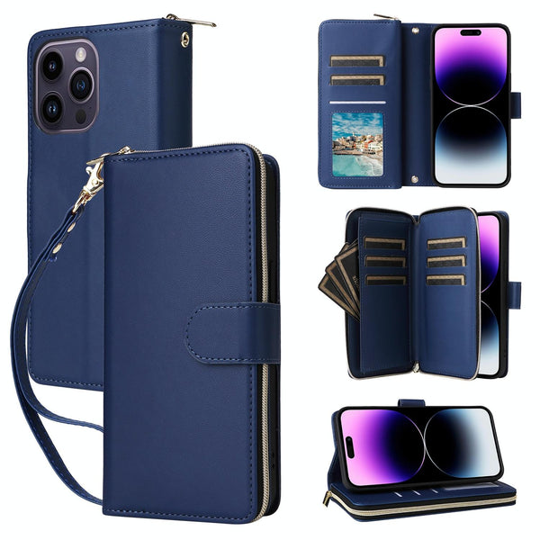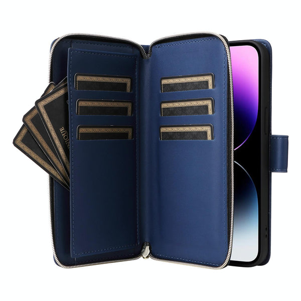 For iPhone 14 Pro Max Nine-card Slots Zipper Wallet Bag Leather Phone Case(Blue)