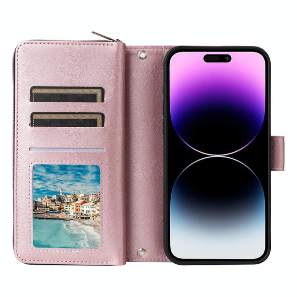 For iPhone 14 Pro Max Nine-card Slots Zipper Wallet Bag Leather Phone Case(Rose Gold)