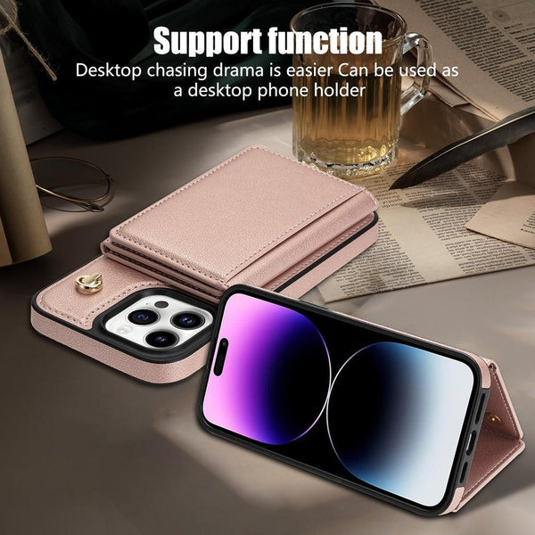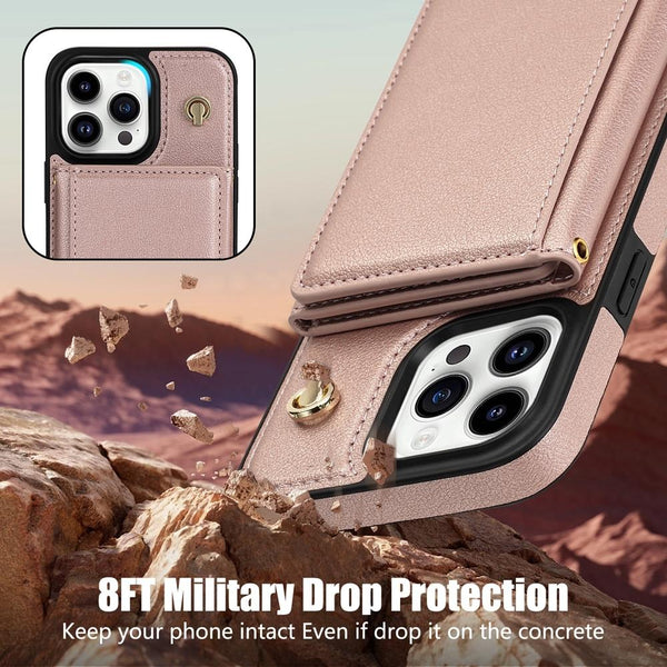 For iPhone 14 Pro Max Three Fold Card Bag Phone Case with Long Lanyard(Rose Gold)