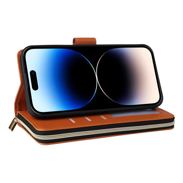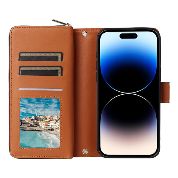 For iPhone 14 Pro Nine-card Slots Zipper Wallet Bag Leather Phone Case(Brown)