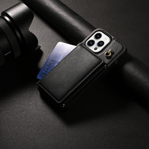 For iPhone 14 Pro Three Fold Card Bag Phone Case with Long Lanyard(Black)