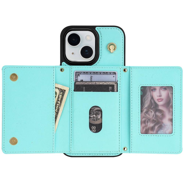 For iPhone 14 Three Fold Card Bag Phone Case with Long Lanyard(Mint)