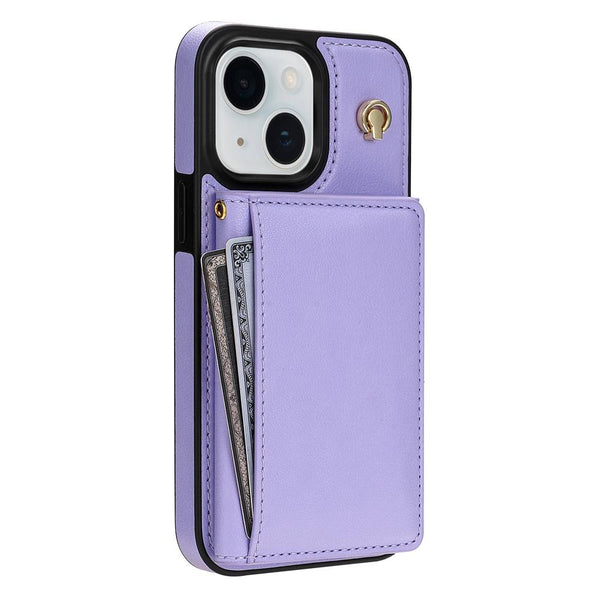 For iPhone 14 Three Fold Card Bag Phone Case with Long Lanyard(Purple)