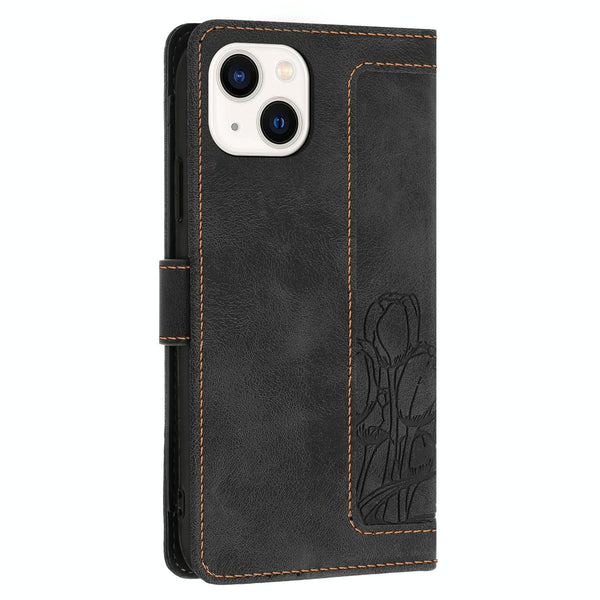 For iPhone 14 Tulips Embossed Leather Phone Case with Lanyard(Black)
