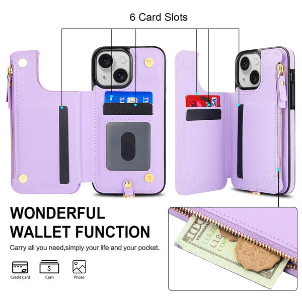For iPhone 15 Double Flap Zipper RFID Leather Phone Case with Short Lanyard(Light Purple)