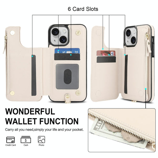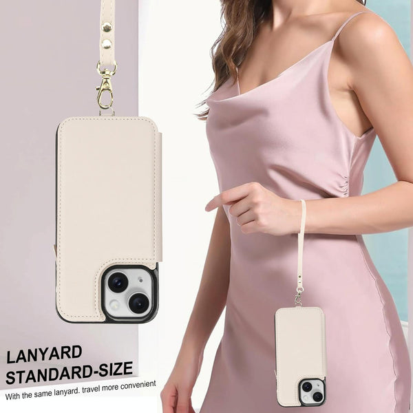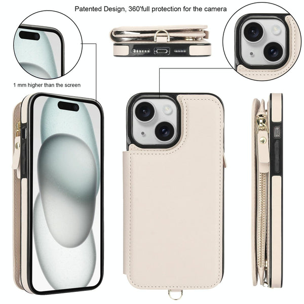 For iPhone 15 Double Flap Zipper RFID Leather Phone Case with Short Lanyard(White)