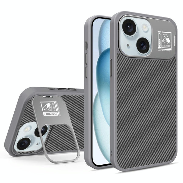 For iPhone 15 Folding Holder Carbon Fiber MagSafe Phone Case(Grey)
