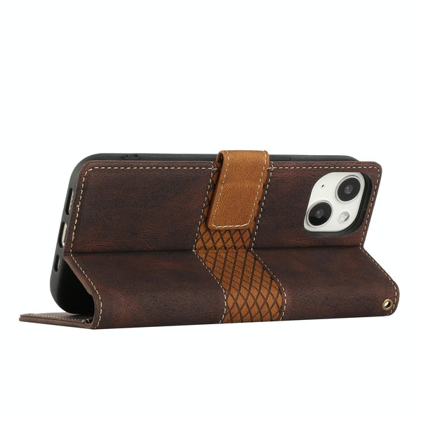For iPhone 15 Grid Stitching Leather Phone Case with Lanyard(Brown)