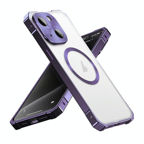 For iPhone 15 Irregular Alloy Frame Fosted Translucent MagSafe Phone Case(Purple)