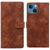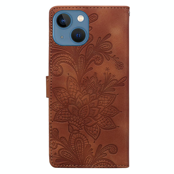 For iPhone 15 Lace Floral Embossed Magnetic Buckle Leather Phone Case(Brown)