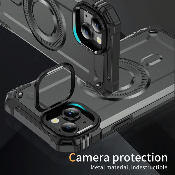 For iPhone 15 Lens Holder MagSafe Phone Case(Grey)