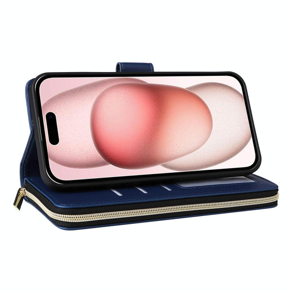For iPhone 15 Nine-card Slots Zipper Wallet Bag Leather Phone Case(Blue)