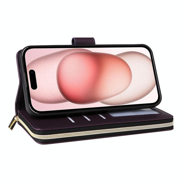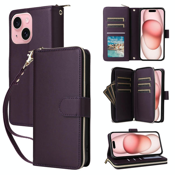 For iPhone 15 Nine-card Slots Zipper Wallet Bag Leather Phone Case(Dark Purple)