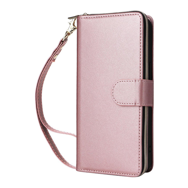 For iPhone 15 Nine-card Slots Zipper Wallet Bag Leather Phone Case(Rose Gold)