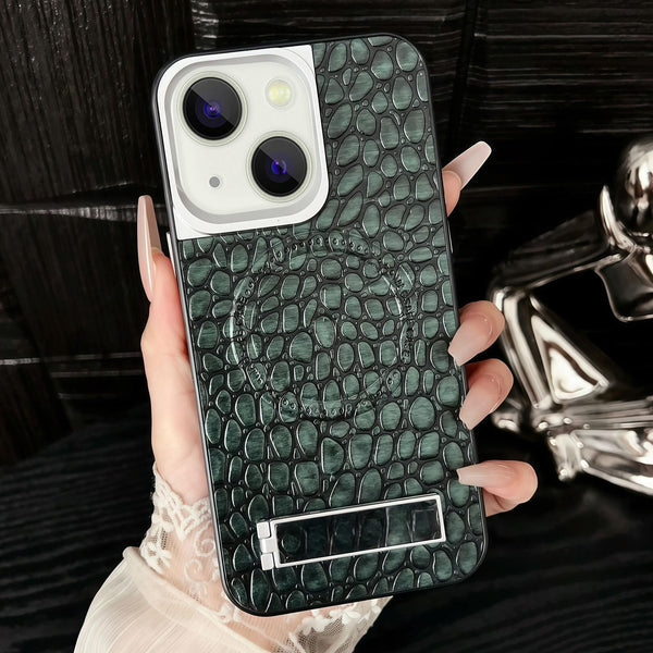 For iPhone 15 Pebble Pattern PU MagSafe Phone Case with Holder(Dark Green)