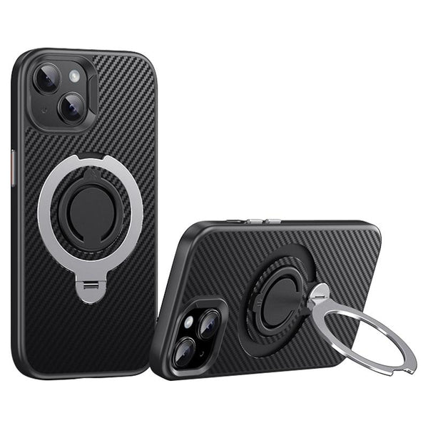 For iPhone 15 Plus / 14 Plus Carbon Fiber MagSafe Phone Case with 360 Degree Rotating Holder(Black Silver)