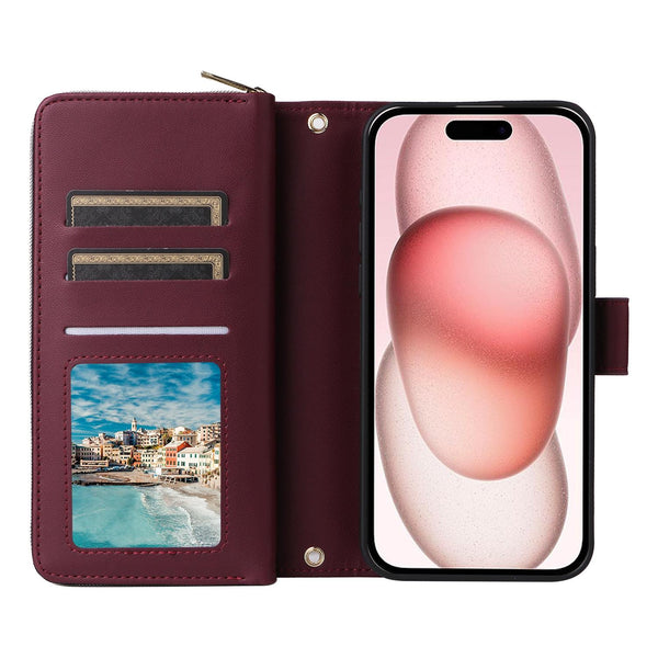 For iPhone 15 Plus / 14 Plus Nine-card Slots Zipper Wallet Bag Leather Phone Case(Wine Red)