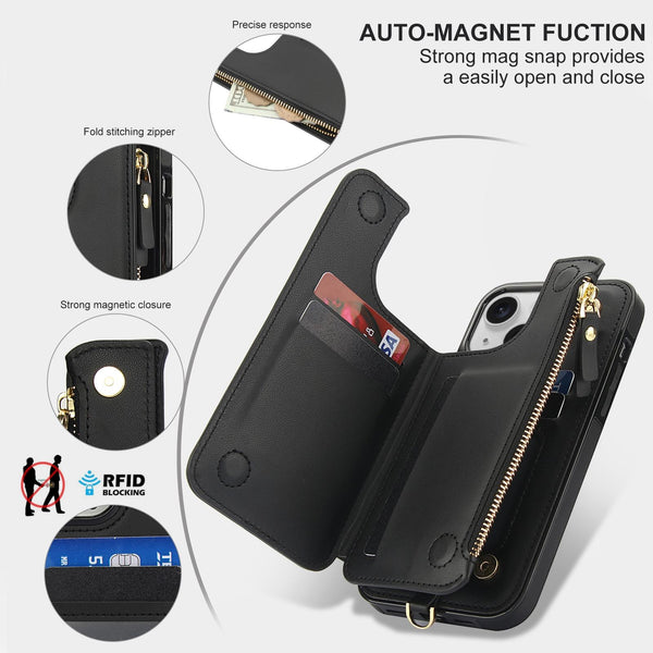For iPhone 15 Plus Double Flap Zipper RFID Leather Phone Case with Short Lanyard(Black)