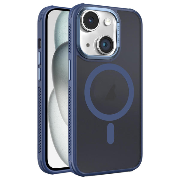 For iPhone 15 Plus Hardware Side Cooling Skin Feel Frosted Metal Lens Frame MagSafe Phone Case(Blue)