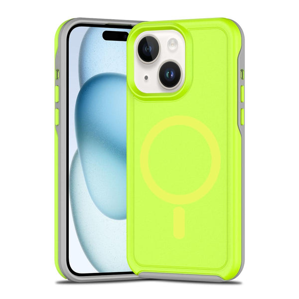 For iPhone 15 Plus Shockproof MagSafe Armor PC Hybrid TPU Phone Case(Fluorescent Green+Gray)