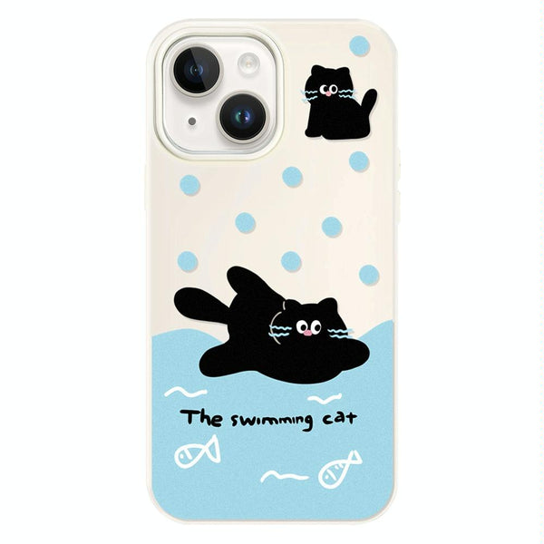 For iPhone 15 Plus Skin Feeling Jelly TPU Hybrid PC Phone Case(Swimming Black Cat White)