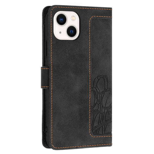 For iPhone 15 Plus Tulips Embossed Leather Phone Case with Lanyard(Black)