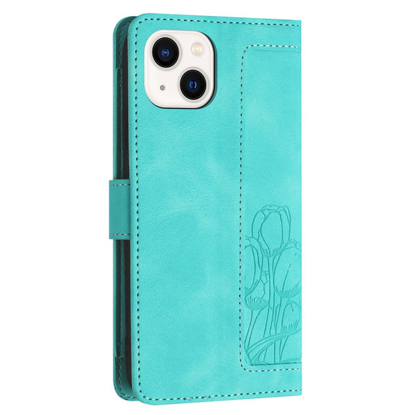 For iPhone 15 Plus Tulips Embossed Leather Phone Case with Lanyard(Green)