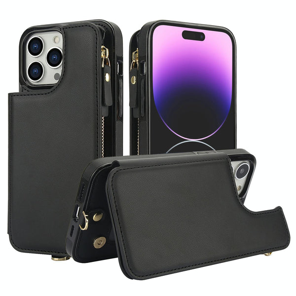 For iPhone 15 Pro Double Flap Zipper RFID Leather Phone Case with Short Lanyard(Black)