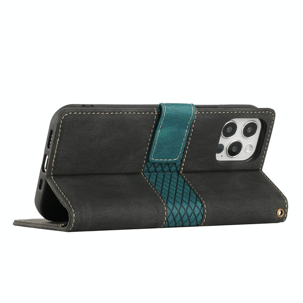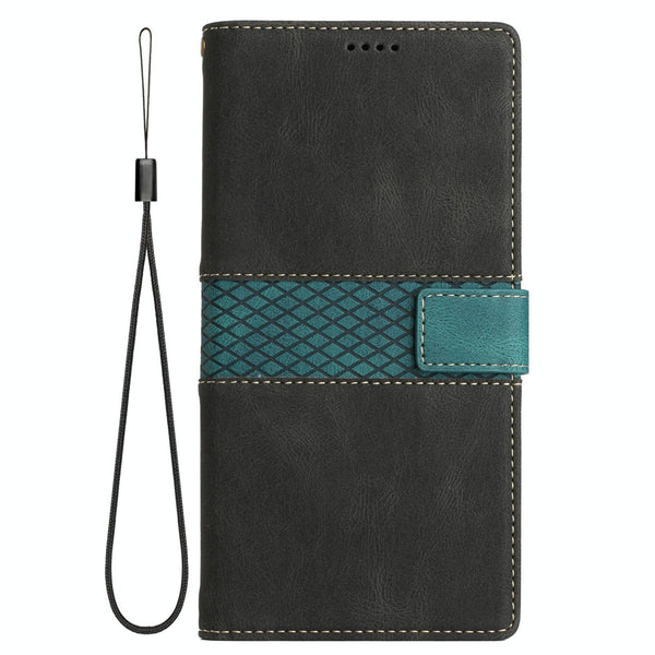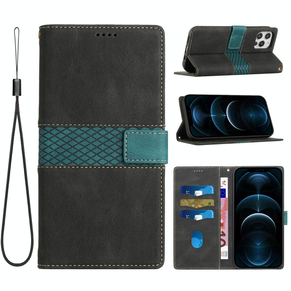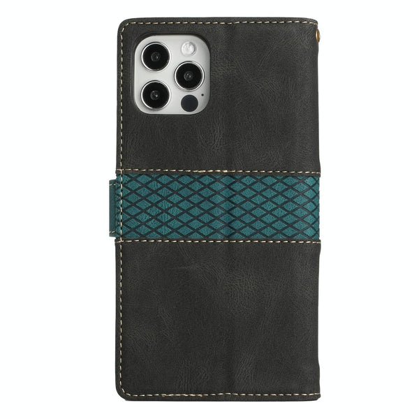 For iPhone 15 Pro Grid Stitching Leather Phone Case with Lanyard(Black)