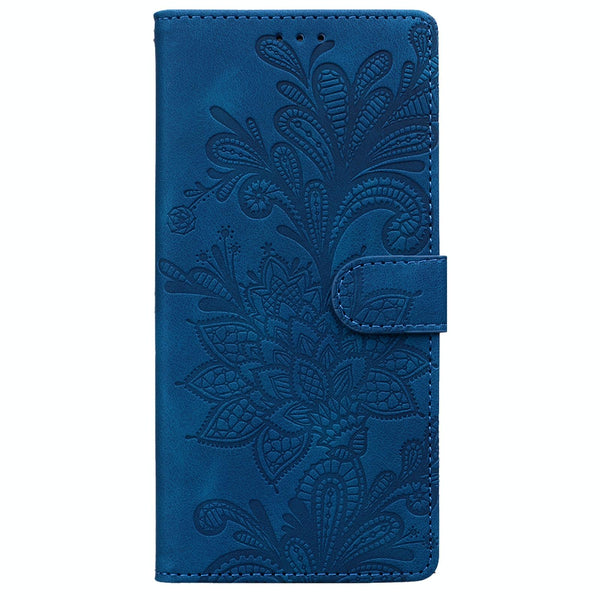 For iPhone 15 Pro Lace Floral Embossed Magnetic Buckle Leather Phone Case(Blue)