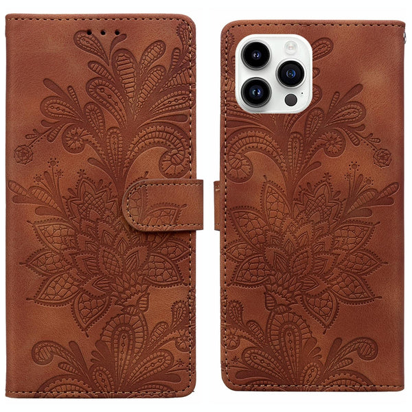 For iPhone 15 Pro Lace Floral Embossed Magnetic Buckle Leather Phone Case(Brown)