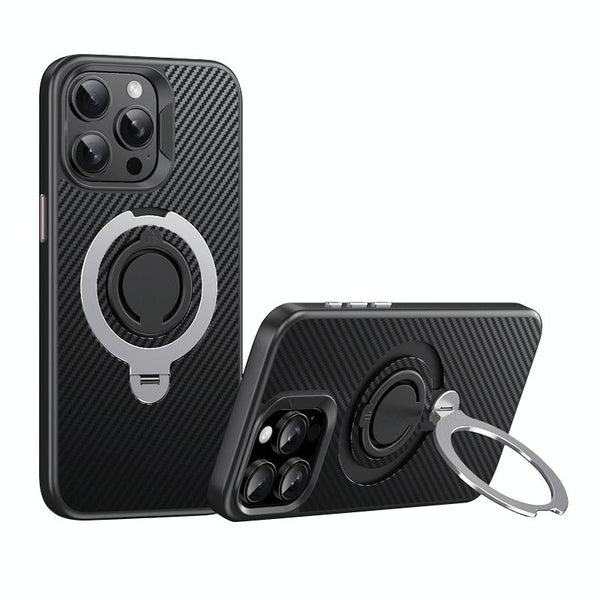 For iPhone 15 Pro Max Carbon Fiber MagSafe Phone Case with 360 Degree Rotating Holder(Black Silver)