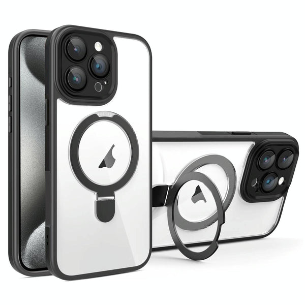 For iPhone 15 Pro Max Full Coverage Lens Film MagSafe Holder Transparent Phone Case(Black)