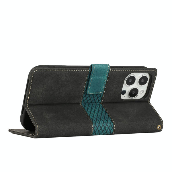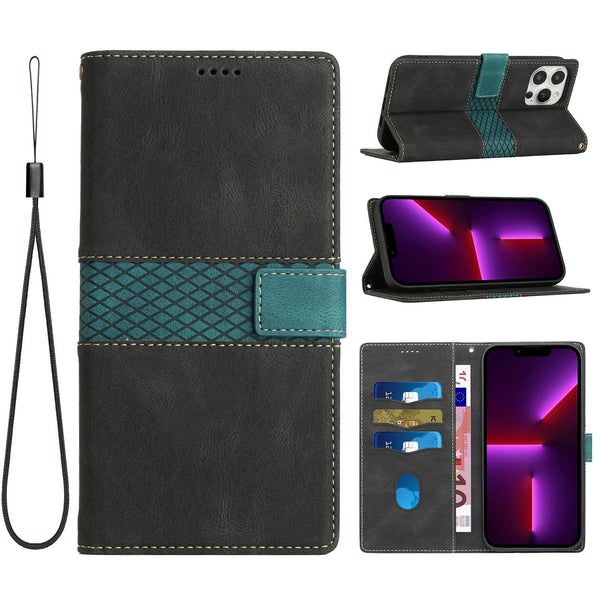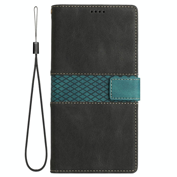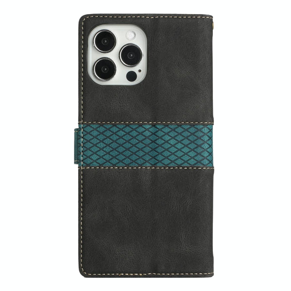 For iPhone 15 Pro Max Grid Stitching Leather Phone Case with Lanyard(Black)