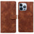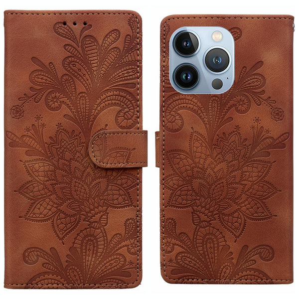 For iPhone 15 Pro Max Lace Floral Embossed Magnetic Buckle Leather Phone Case(Brown)