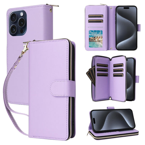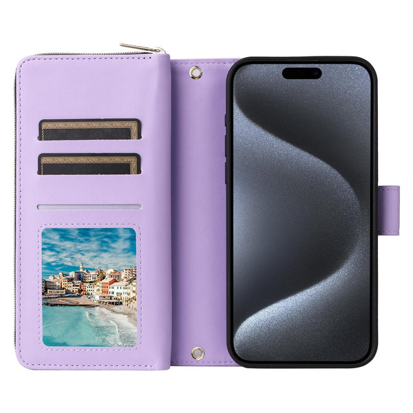 For iPhone 15 Pro Max Nine-card Slots Zipper Wallet Bag Leather Phone Case(Light Purple)