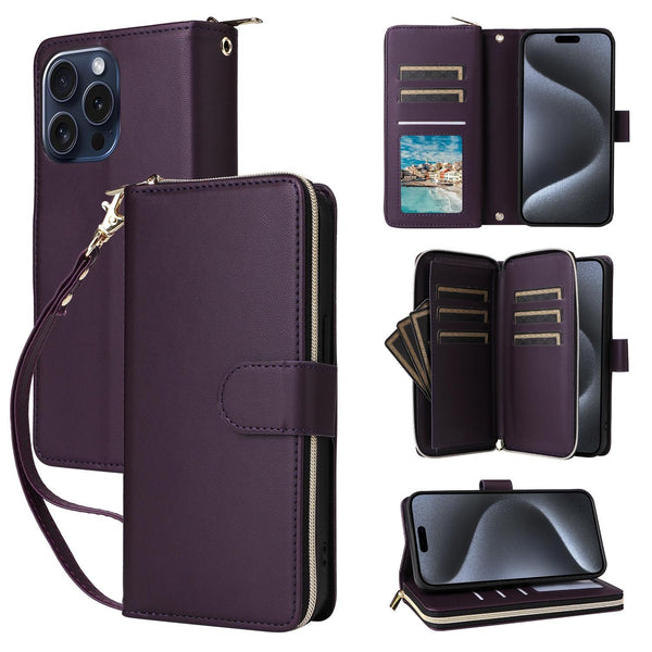 For iPhone 15 Pro Nine-card Slots Zipper Wallet Bag Leather Phone Case(Dark Purple)