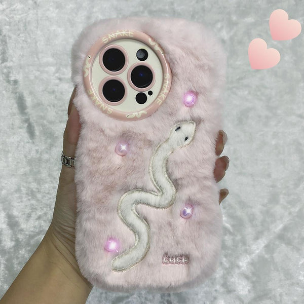 For iPhone 15 Pro Snake Embroidery Plush Silicone Phone Case(Snake And Pink)