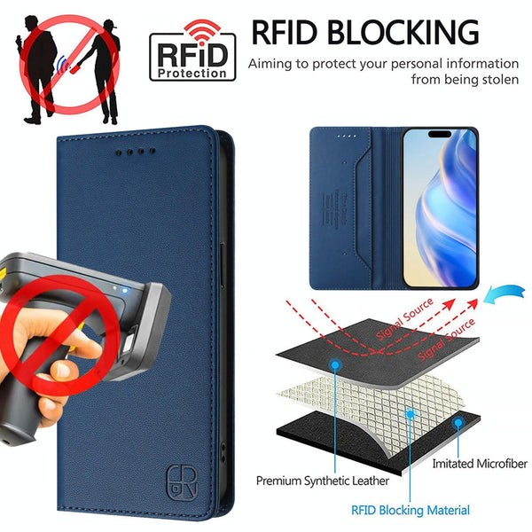 For iPhone 15 RC01 Dual-Folded Magnetic Suction RFID Leather Phone Case(Dark Blue)