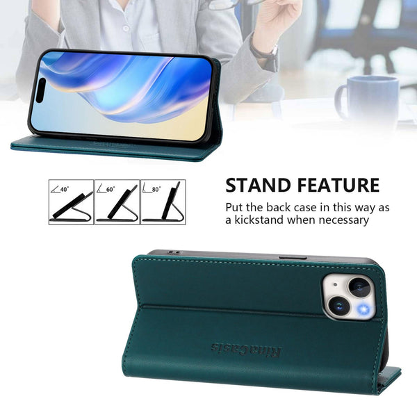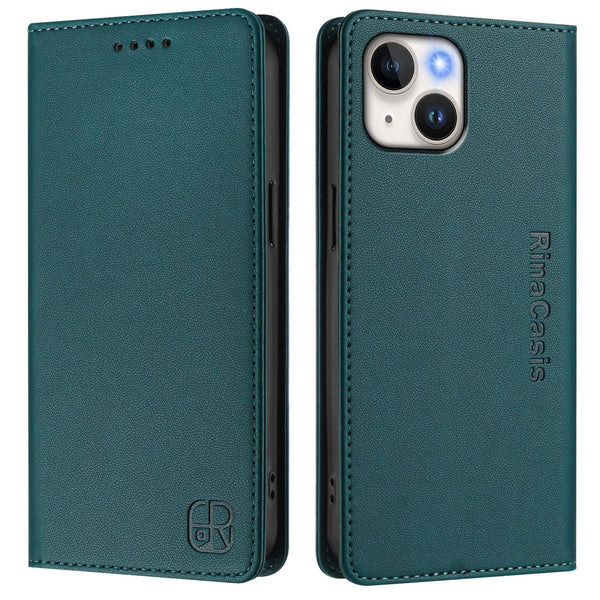 For iPhone 15 RC01 Dual-Folded Magnetic Suction RFID Leather Phone Case(Dark Green)