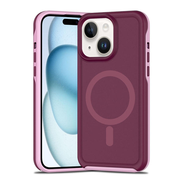 For iPhone 15 Shockproof MagSafe Armor PC Hybrid TPU Phone Case(Wine Red+Light Pink)