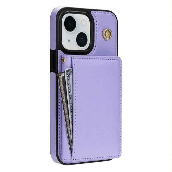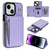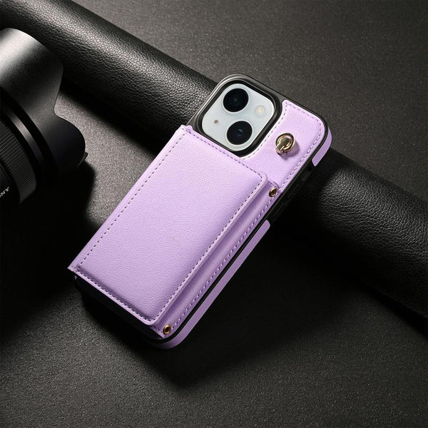 For iPhone 15 Three Fold Card Bag Phone Case with Long Lanyard(Purple)