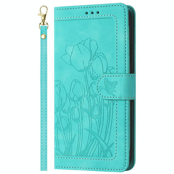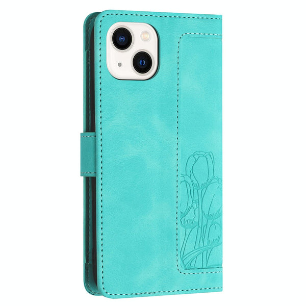 For iPhone 15 Tulips Embossed Leather Phone Case with Lanyard(Green)