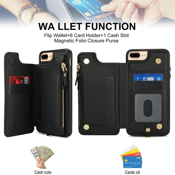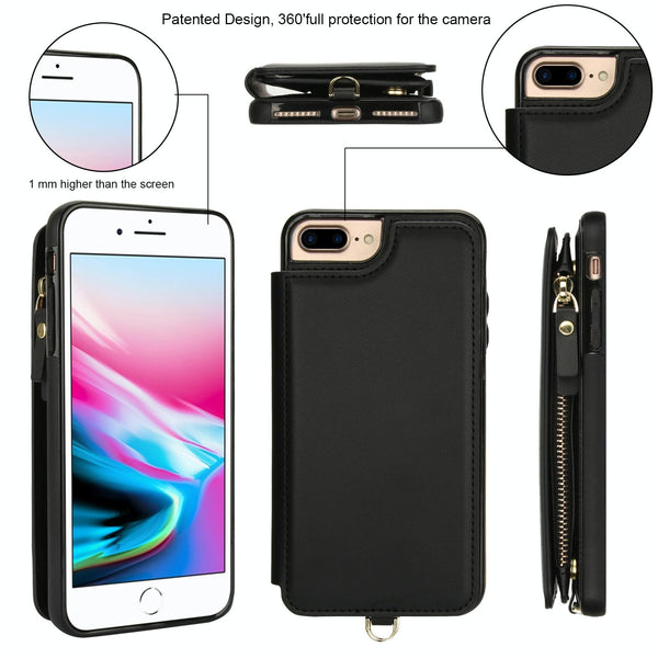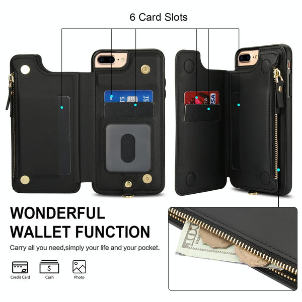 For iPhone 8 Plus / 7 Plus Double Flap Zipper RFID Leather Phone Case with Short Lanyard(Black)